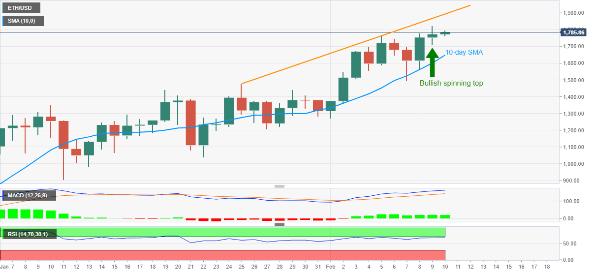 ETH/USD rises to $1,793, up 1.20% intraday, during early Wednesday. The cryptocurrency pair refreshed an all-time high the previous day before easing from $1,824.53. In doing so, the altcoin marked the buyers’ exhaustion via daily candlestick.