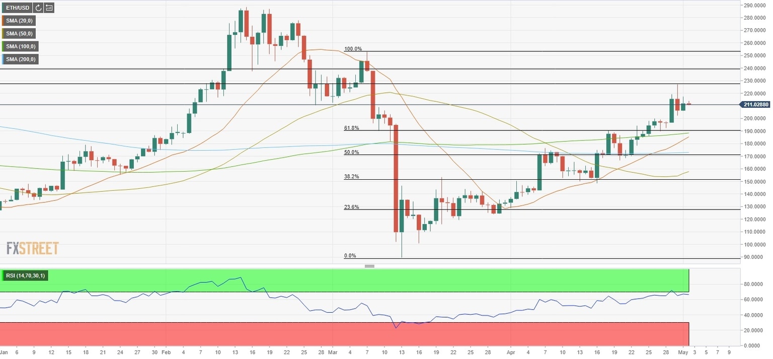 Ethereum (ETH/USD) rose sharply on Wednesday and climbed above the critical $200 handle for the first time since early March. Although the pair retreated from the near-term top it set at $227, it didn't have a difficult time staying above $200. As of writing, the pair was little changed on a daily basis at $211.50.