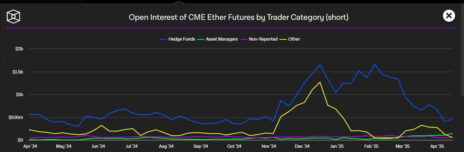 Ethereum short positions on the CME have declined steadily since Trump's tariffs set in, dropping below $500 million across all traders categories for the first time in 2025.