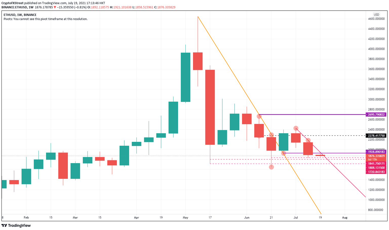 Ethereum price action is minimal on the upside, with a double cap at $1,928.89. The red descending trend line is well respected there, and the flat purple line falls perfectly in place with that level, which originated in the last week of June as the low for that week.