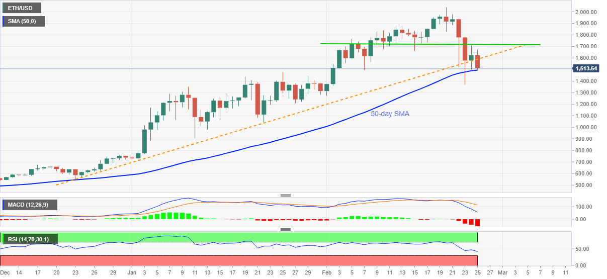 Even so, bearish MACD and downward sloping RSI line favor the sellers targeting $1,200. Though, a sustained break below the 50-day SMA level of $1,495 becomes necessary for the ETH/USD sellers.