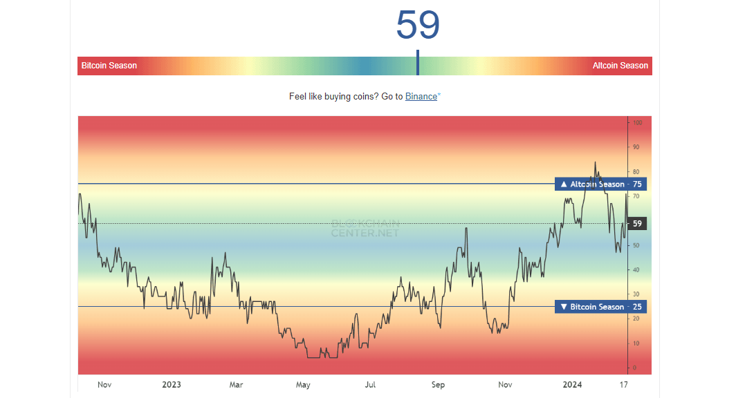 Alt season is a colloquial term that is used to describe a phase where investing in altcoins provides better returns compared to Bitcoin or Ethereum. Consequently, the dominance that Bitcoin holds in the market declines, and that of altcoins increases. The alt season indicator from BlockchainCenter is also leaning in favor of a potential altcoin season taking place as opposed to a Bitcoin season.