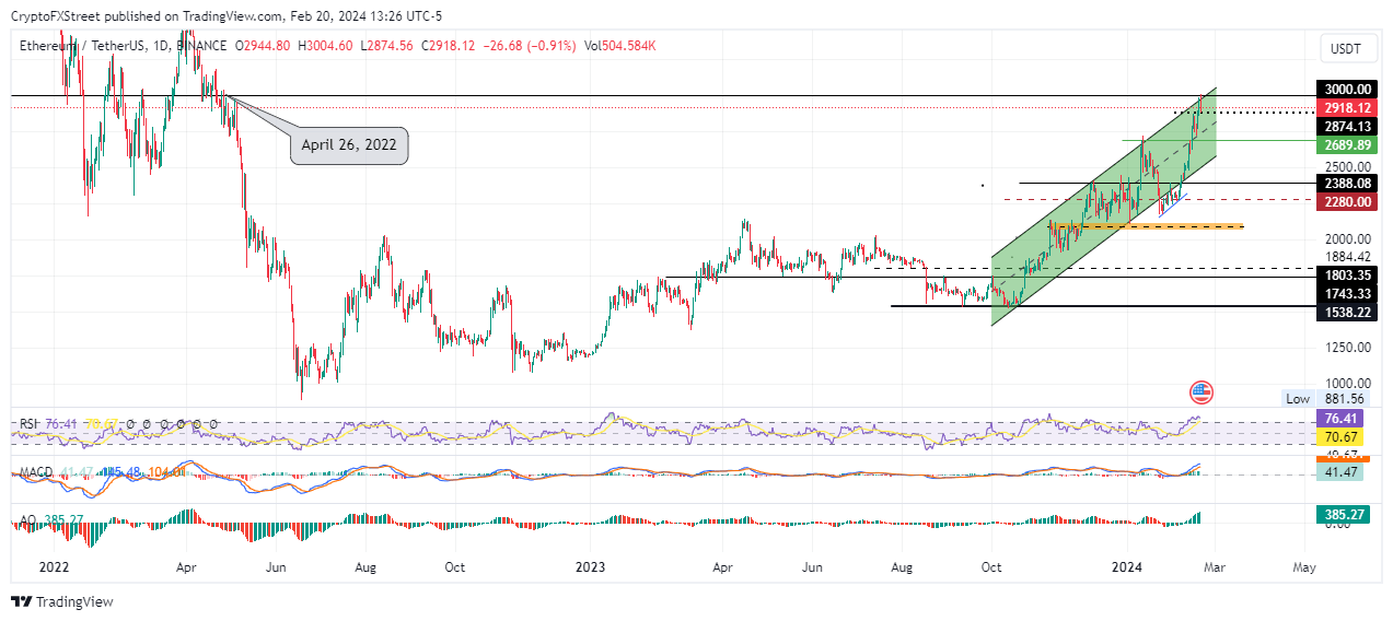 Ethereum (ETH) price scrapped the $3,000 psychological level on Tuesday, a level last tested on April 26, 2022, almost two years ago. It comes a day after the Proof-of-Stake (PoS) token outperformed BTC with double-digit weekly gains and a spike in Open Interest.