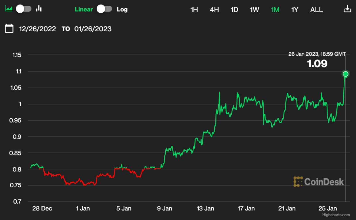 The rally comes amid a January upturn in the crypto market that has seen Aptos’ APT token skyrocketing more than 400%, Fantom’s FTM jumping about 145% and bitcoin rising nearly 40%.