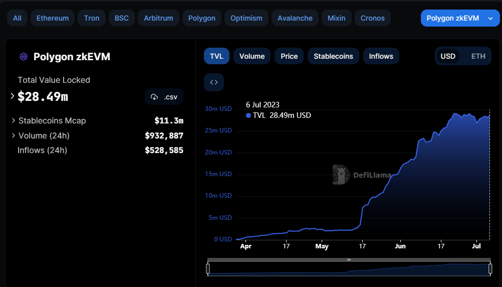 Data on DeFiLlama also corroborates the thesis, showing the total value locked (TVL) of zkEVM has been on a steady ascent since April to the current score of $28.49 million, as seen in the chart below: