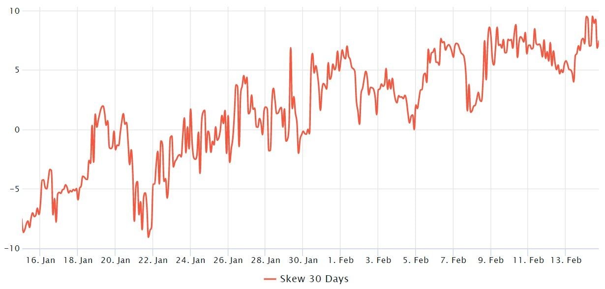 The delta skew flirted with the bearish 10% level on Feb. 14, signaling stress from professional traders. That is a stark contrast from late January when the 25% skew index hovered near 2% — indicating similar upside and downside risks.