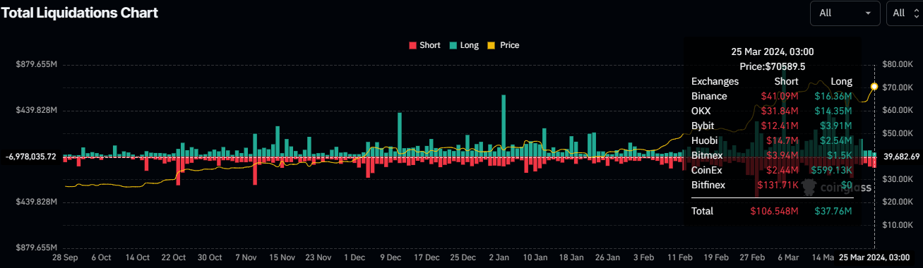 Bitcoin price shattered the $70,000 threshold on Monday, causing almost $145 million in total liquidations across the market, composed of $106 million in short positions and almost $38 million in longs.