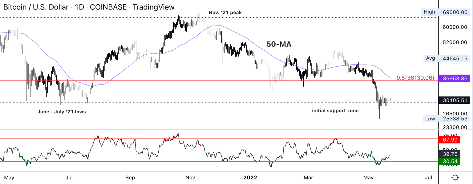 On the weekly chart, the RSI is the most oversold since March 2020, although momentum signals remain negative. That suggests upside could be limited for BTC, initially toward the $33,000-$35,000 resistance zone.