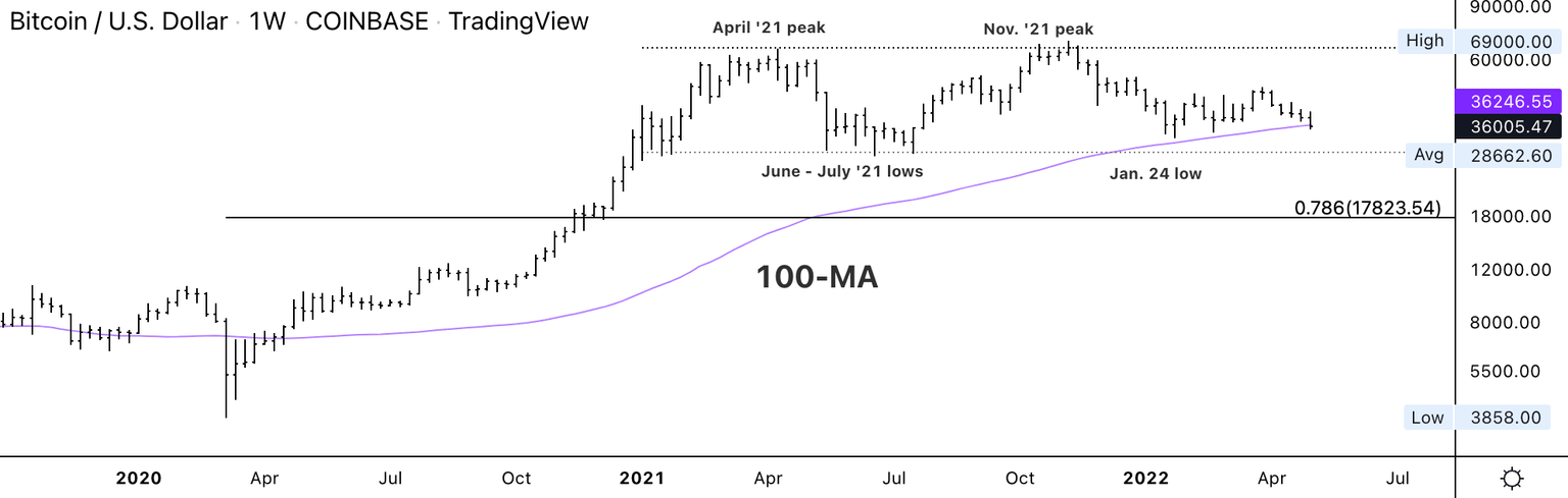 On the weekly chart, BTC is at risk of breaking below its 100-week moving average of $36,247. A second weekly close below that level could yield downside targets toward $30,000 and then $17,823 (a roughly 80% peak-to-trough decline, on par with the 2018 crypto bear market).