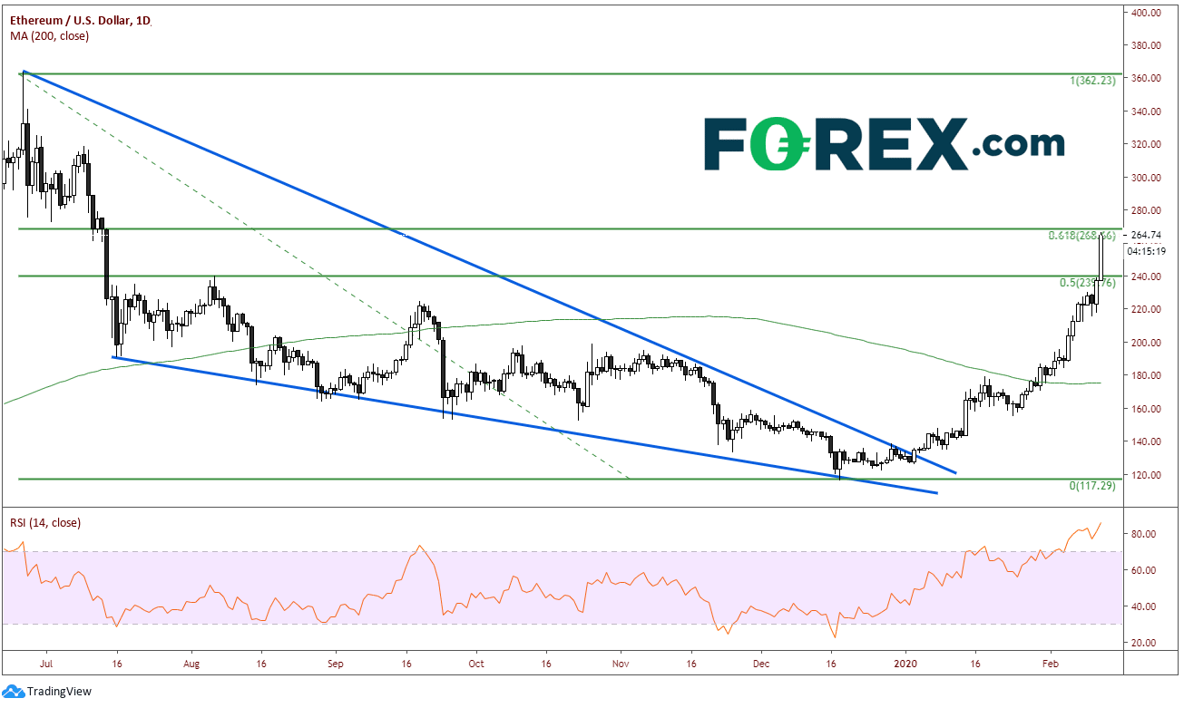 Bitcoin (BTC)…. The darling of crypto coins. My colleague, Matt Weller, discussed earlier today how the price of bitcoin has been slowly rising above $10,000, currently trading near $10,325. He also writes how BTC many be ready for a pause in the 40%+ ascension since the beginning of the year. Price action today put in a shooting star on the daily timeframe, while retracing to 50% of the move from the highs on June 25th, 2019 to the lows on December 18th at $10,245. The RSI is beginning to diverge as it tries to pull back after today’s candle. Still, BTC is up .71% on the day.