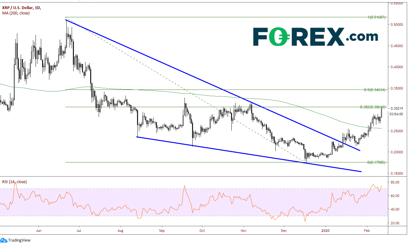Not the be outdone, LTC and XRP have moved in similar fashion to BTC and ETH. Both moved lower from the June highs, and both broke higher out of falling wedge formations in later December 2019. However, both LTC and XRP have only been able to retrace to the 38.2% level from the June 2019 highs to the December 2019 lows. Still, LTC is at $82.15, up 6.7% today, while XRP is at $.3029, up 7.55% today. Notice once again how the RSI’s are also in overbought condition but are still pointing higher.