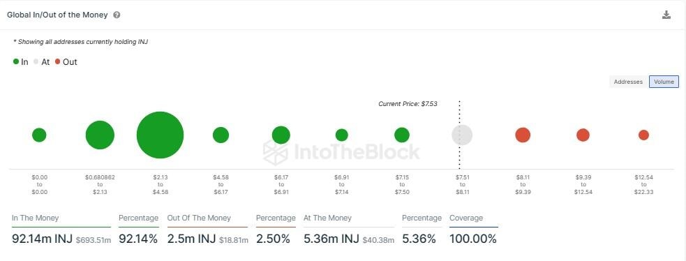 On-chain analytics and market intelligence platform IntoTheBlock show that at the current price, 92.14% of addresses holding INJ are sitting on unrealized profit (in the money), while only 2.50% are sitting on unrealized losses (out of the month). Meanwhile, 5.36% are breaking even (at the money).