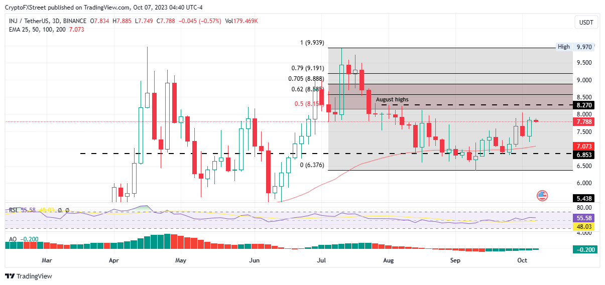 - INJ could rise 6% to clear the August highs of $8.270 by clearing the 50% Fibonacci Retracement.
