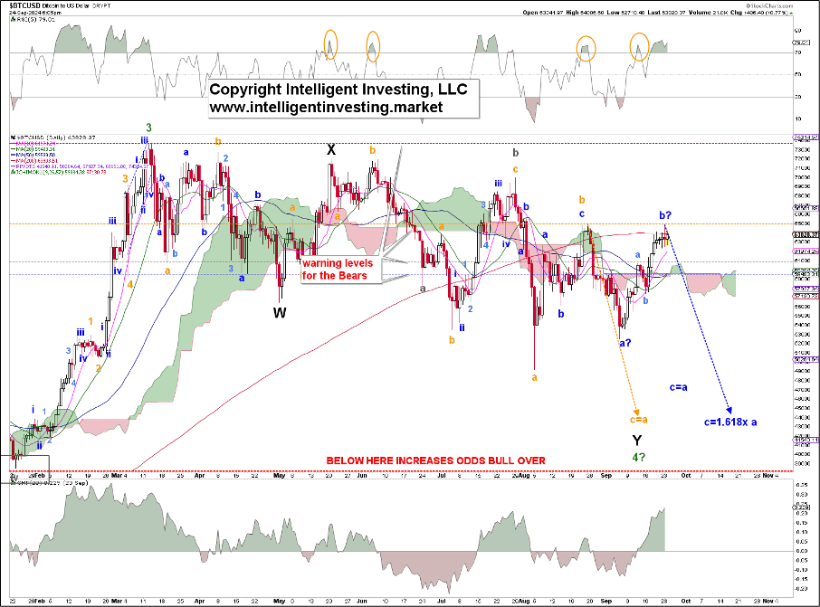 In that case, the recent rally was most likely a(nother) B-wave bounce, and a final C-wave to ideally $44-48K should be expected for an even more protracted W-X-Y correction than we already have at the August low. We placed the warning levels for the Bears on the chart that will tell us above which prices such a lower low become less and less likely. Currently, the Bulls are knocking at the 3rd, orange, door, making this EWP less likely than a month ago. But it remains our insurance policy, just in case.