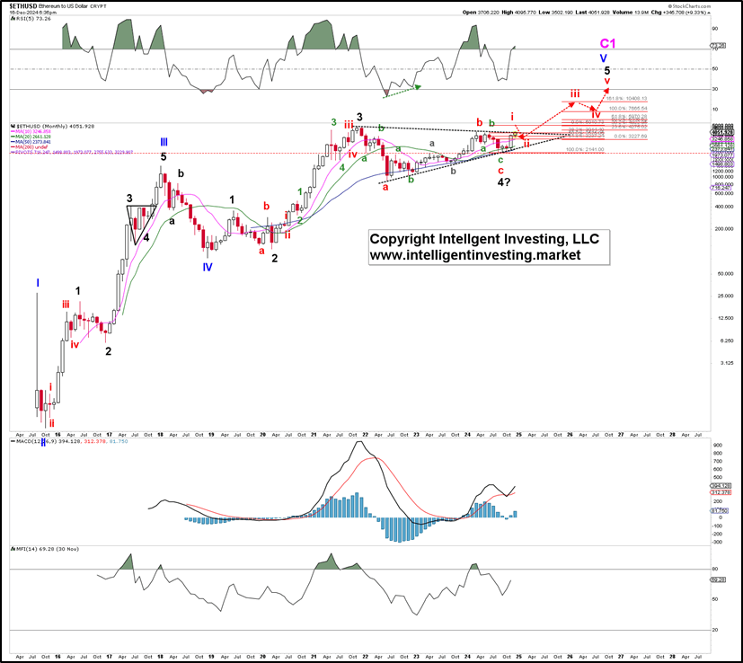 Fast-forward and ETHUSD broke above $2800 on November 7. That told us to don our Bull hat, as Ether had unfinished business to the upside. As such, we’ve kept a Bullish posture for our Premium Members by tracking a potential Elliott Wave impulse path higher. See Figure 1 below.
