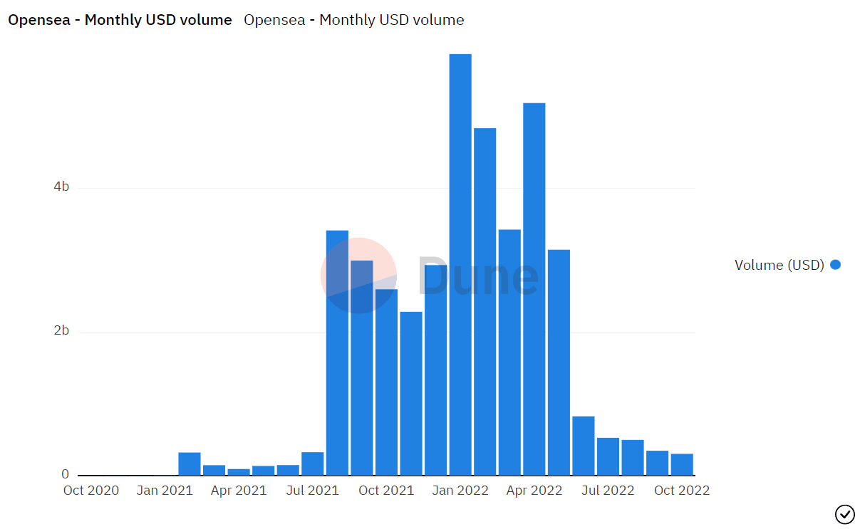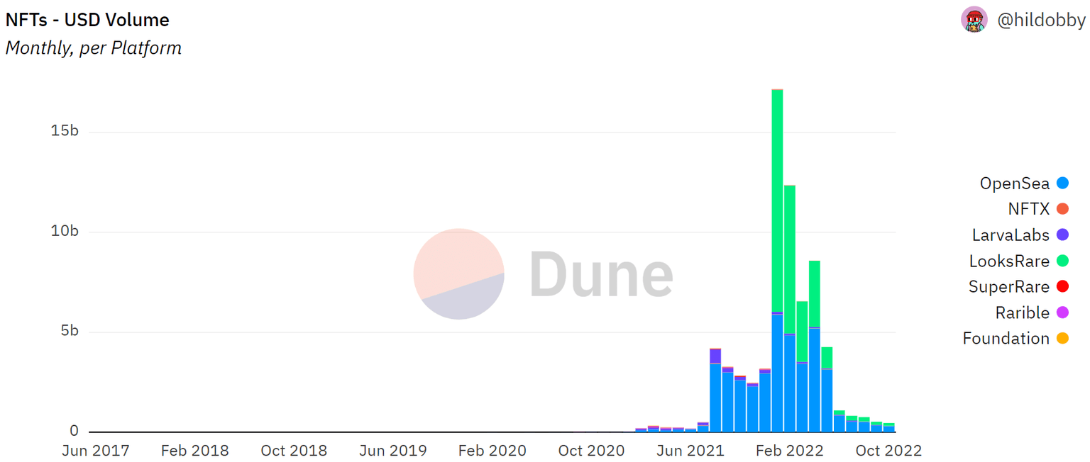 The condition of other NFT marketplaces is no better. Since Opensea is the biggest marketplace to exist, it represents more than 66% of all NFT sales volume. The combined sales of all marketplaces, including Opensea, barely crossed $450 million.