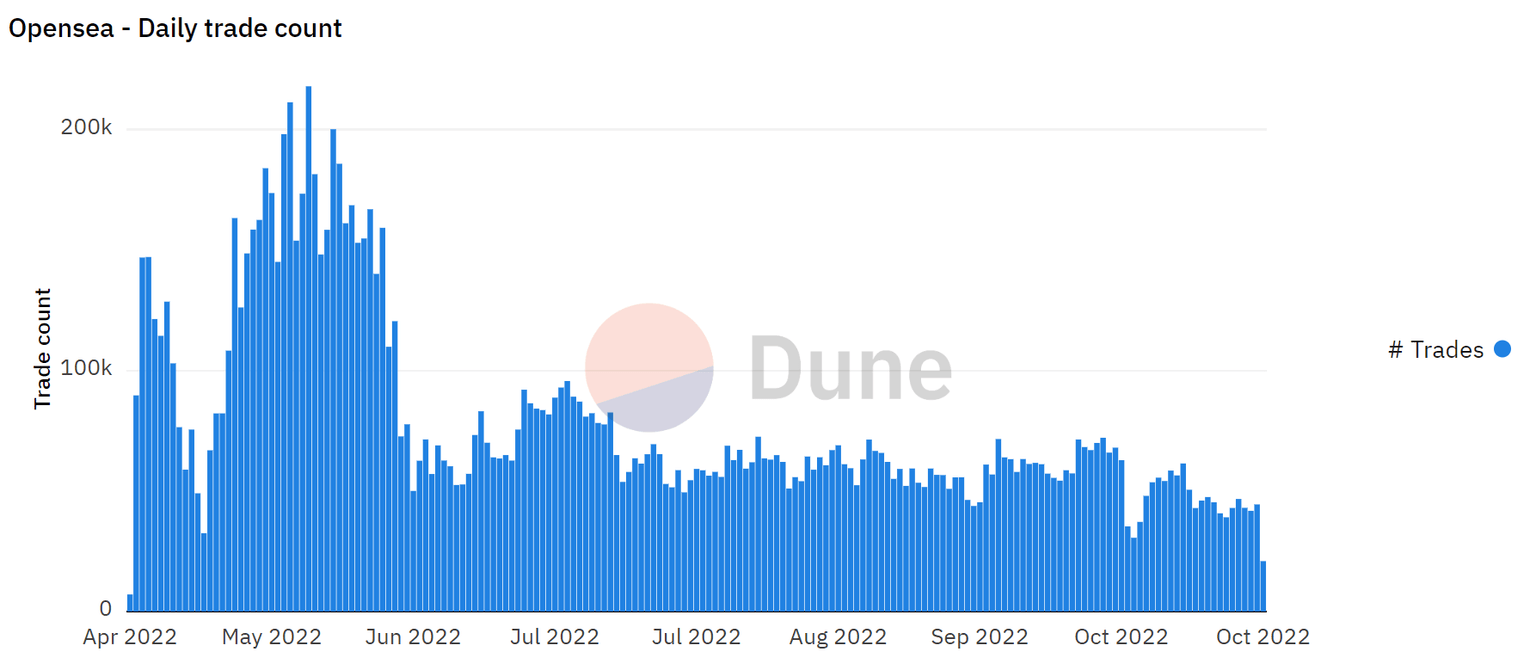 - Opensea’s daily trades have reduced from 217,000 to 20,800 in just five months.