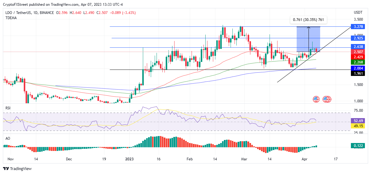 With bulls buying the rumor, the LDO market experienced increased buyer momentum. This could see Lido DAO price shatter the immediate barricade at $2.63. Further north, the altcoin could confront the next roadblock at $2.92 or tag the $3.27 resistance level in highly bullish cases. Such a move would denote a 30% ascent from the current price of $2.50.