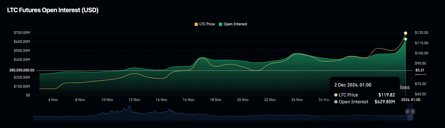 After $225 million in capital inflows in seven days, Litecoin's open interestreached $629 million on Monday.