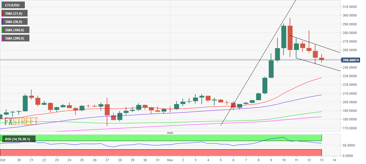 The corrective decline in Litecoin price appears to have lost steam from six-month highs of $298, as LTC bulls look to regain control this Saturday.