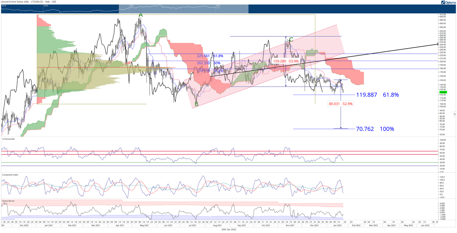 Litecoin price positioned for a 40% move lower, extending the bearish oulook