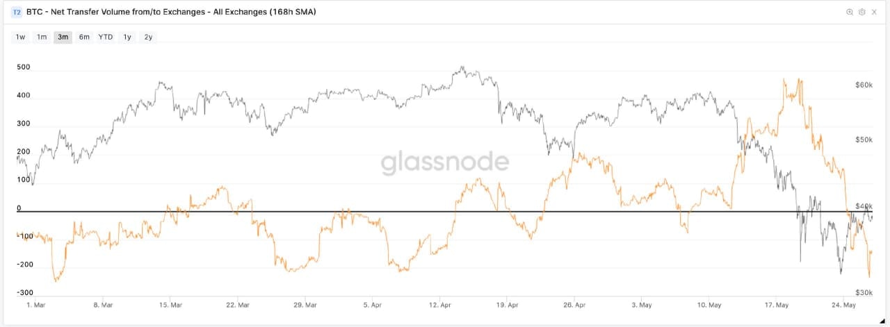 BTC net transfer volume to/from all exchanges. Source: Glassnode