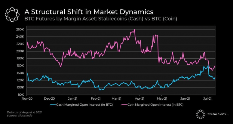 The margin assets for bitcoin futures trading has been shifting from bitcoin to stablecoins, according to Delphi Digital, a research company that focuses on digital assets. The shift has become especially significant as cash margined open interest soared after bitcoin’s price crashed in May.