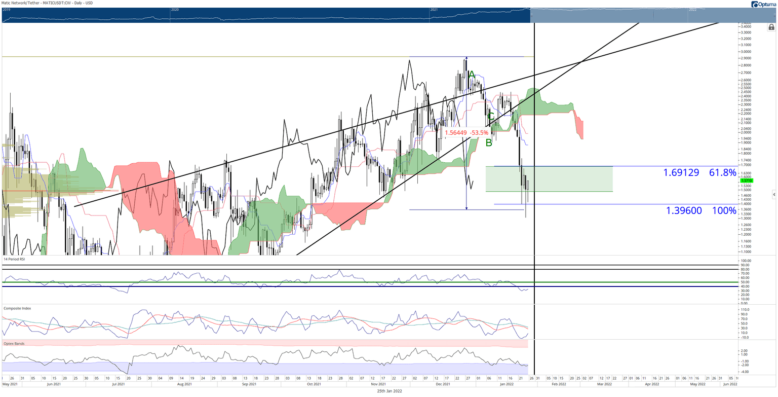 The black vertical line on the weekly chart represents an upcoming Kumo Twist in the Ichimoku system. Kumo Twists often act as turning points for price action. If an instrument is trending at or near a Kumo Twist, important turns in the market can occur by creating new major/minor swing highs/lows. For example, the current corrective move for MATIC price culminates right next to the upcoming Kumo Twist, indicating a swing low has formed a new uptrend will begin.