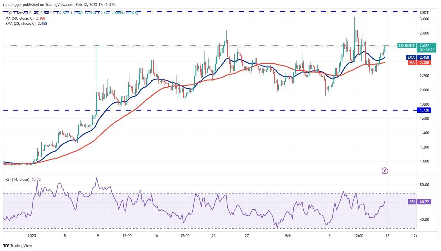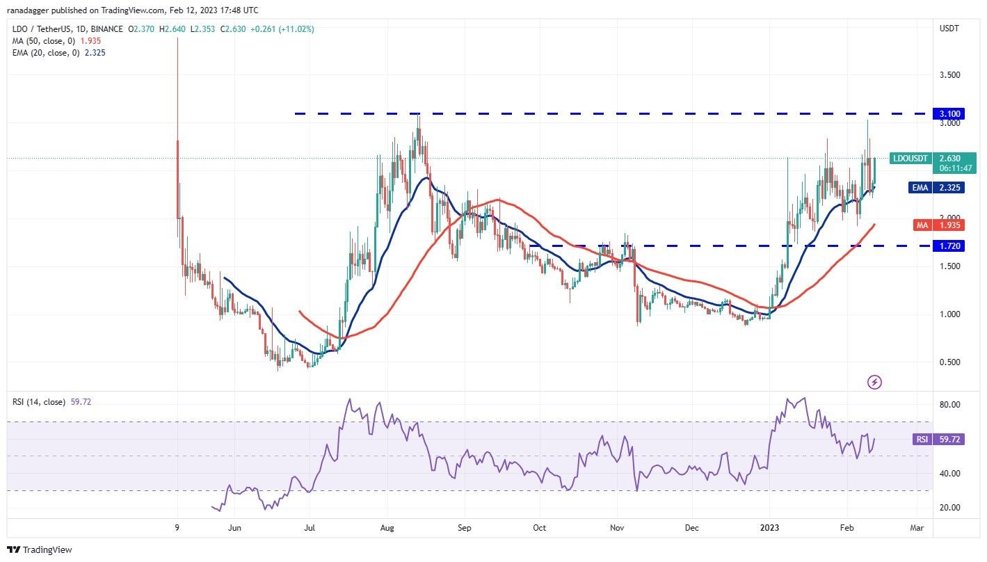LidoDAO (LDO) has been volatile in the past few days but a positive sign is that the bulls have successfully defended the 20-day EMA ($2.32). This indicates that the sentiment remains positive and traders are buying the dips.