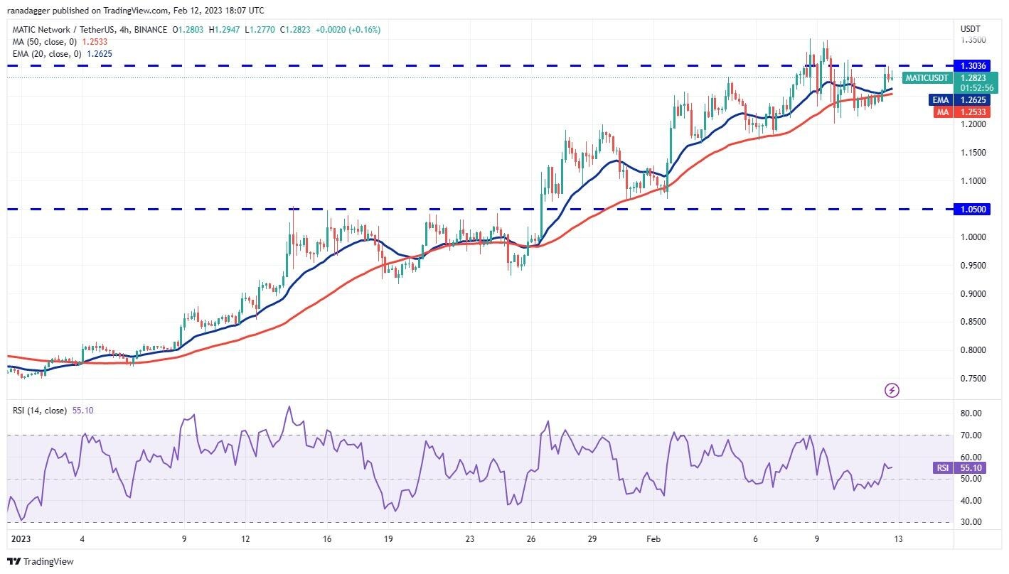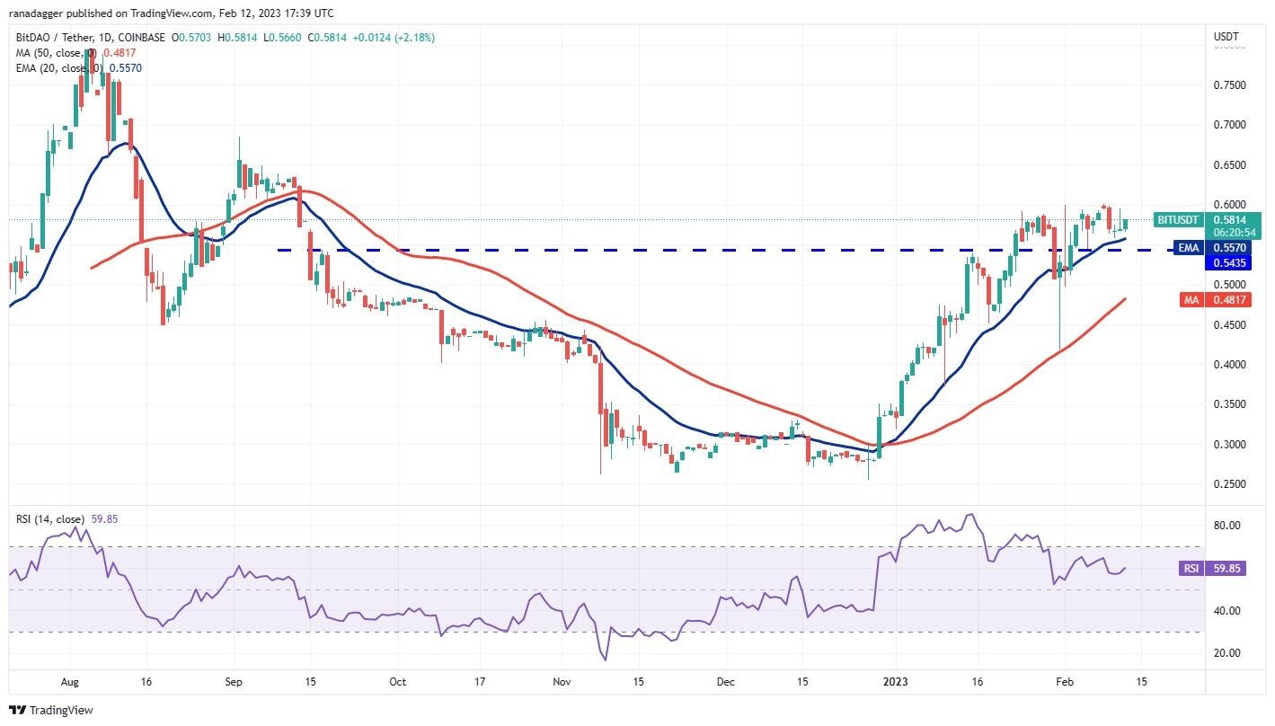 The BIT/DAO pair is not out of danger yet because the long wick on the Feb. 11 candlestick shows that bears are selling on rallies near $0.60. The bears will again try to sink and sustain the price below the 20-day EMA. If they can pull it off, the pair could extend its pullback to the 50-day SMA ($0.48).