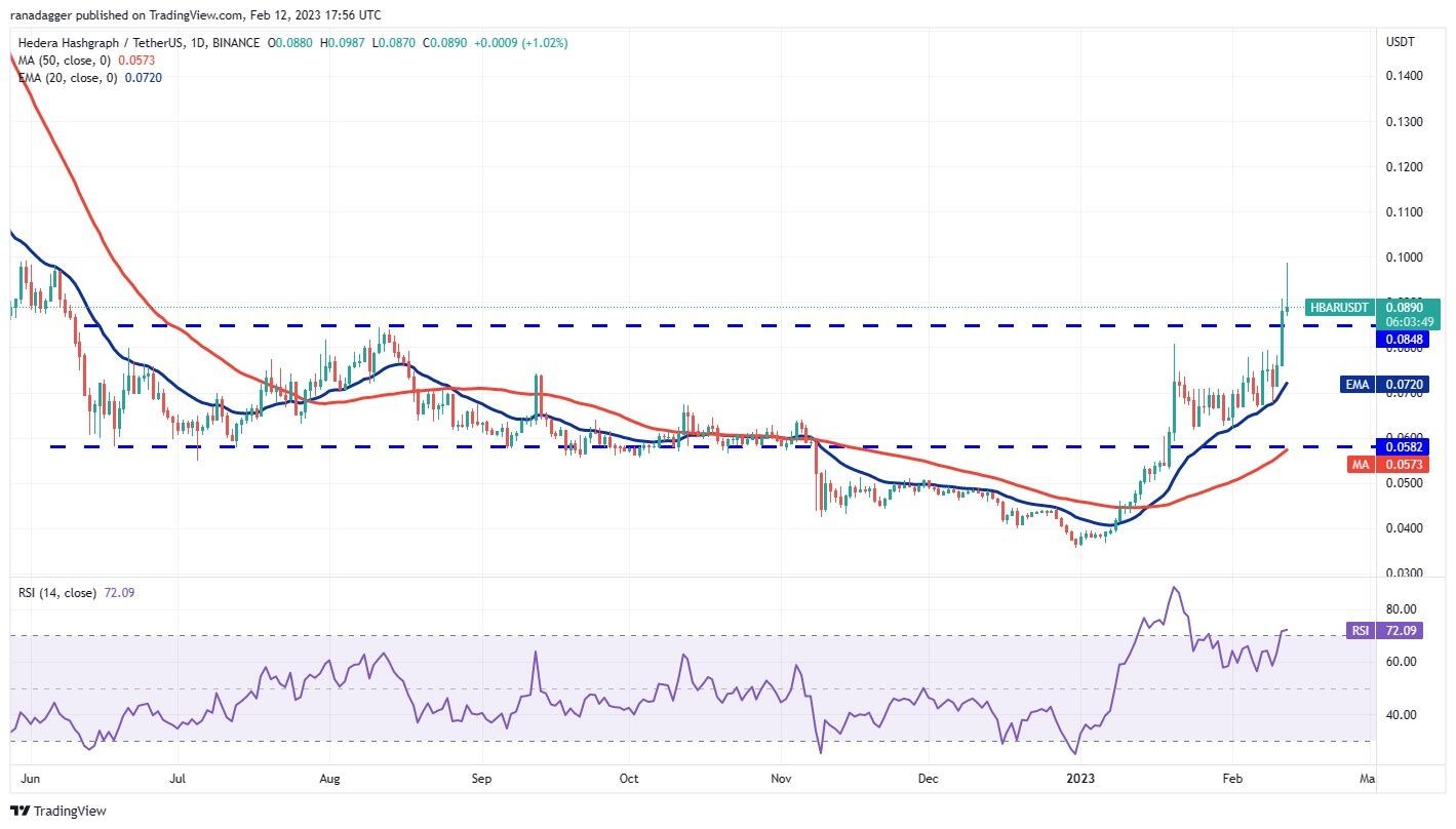 The 20-day EMA ($0.07) is sloping up and the RSI is in the overbought territory, indicating that bulls are in command. However, the long wick on the Feb. 12 candlestick shows selling at higher levels.
