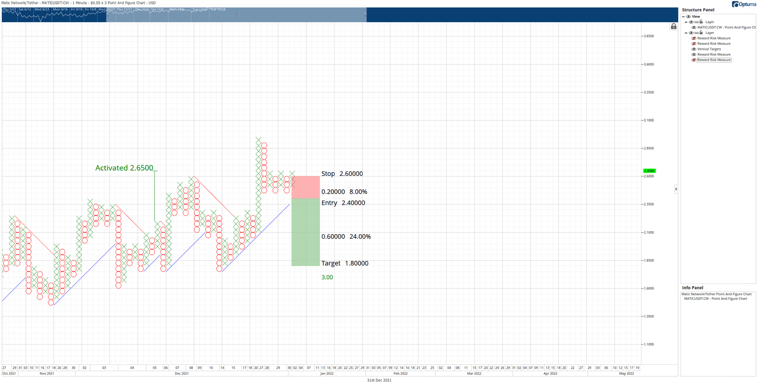 MATIC price has two trade opportunities on its $0.05/3-box Reversal Point and Figure Chart. The first theoretical trade is a buy stop order at $2.70, a stop loss at $2.50, and a profit target at $3.25. The entry is based on a breakout above a triple-top. The trade represents a 2.75:1 reward for the risk setup.