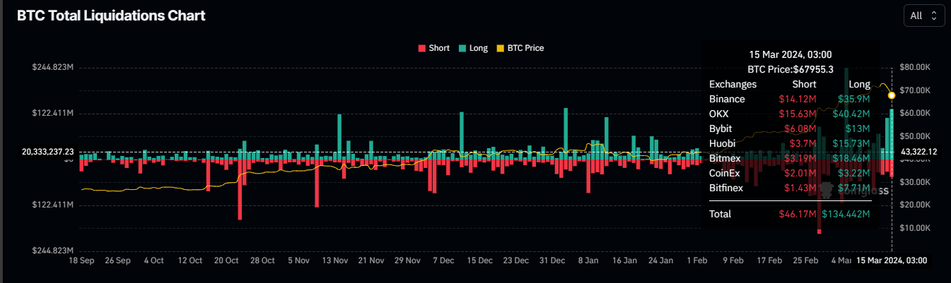 The drop blew $134 million longs out of the water, while at the same time liquidating $46 million in short positions. The total BTC liquidations were above $180 million as of 18:00 GMT.