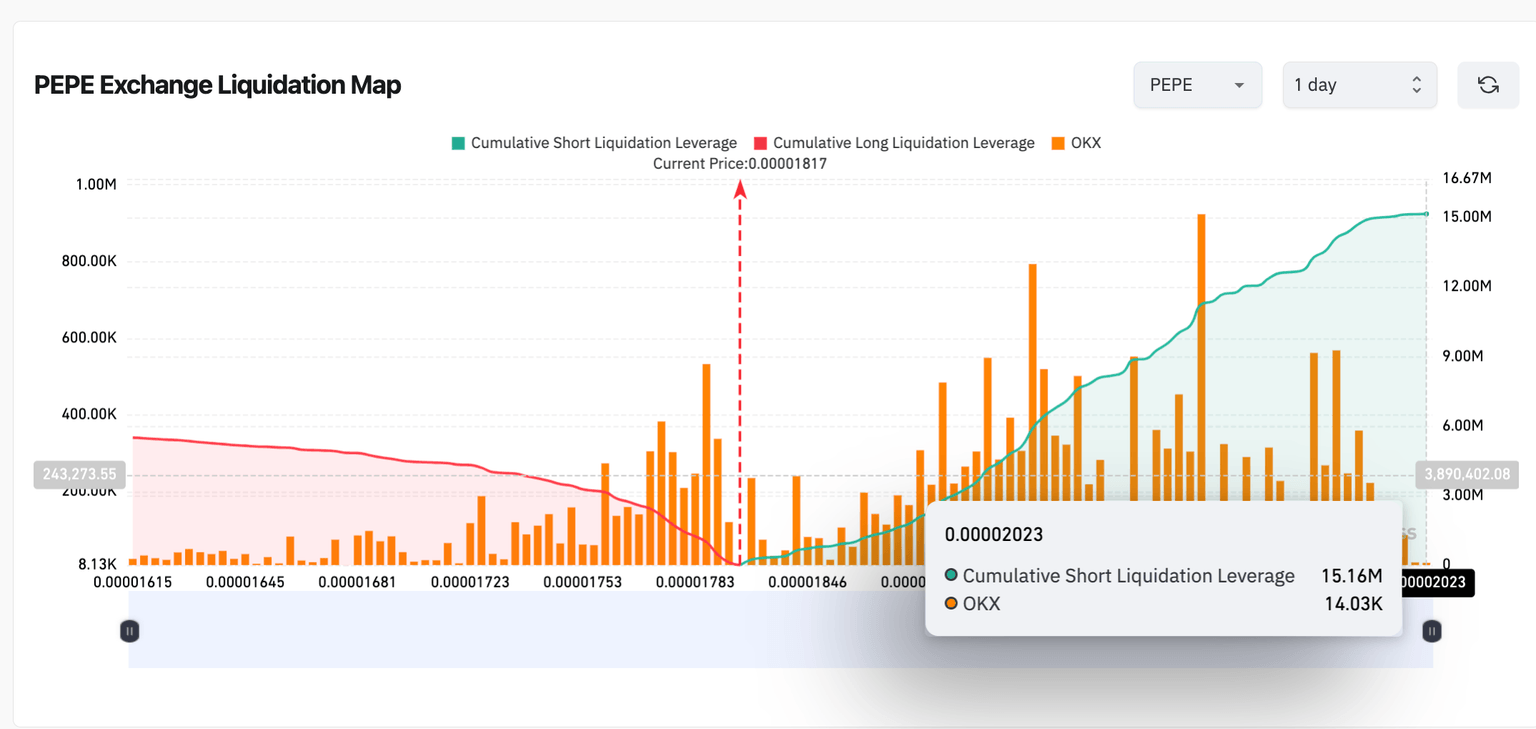 The PEPE Exchange Liquidation Map reveals that cumulative short leverage positions have surged to $15.1 million, dwarfing active long positions of just $5.5 million by over 85%.