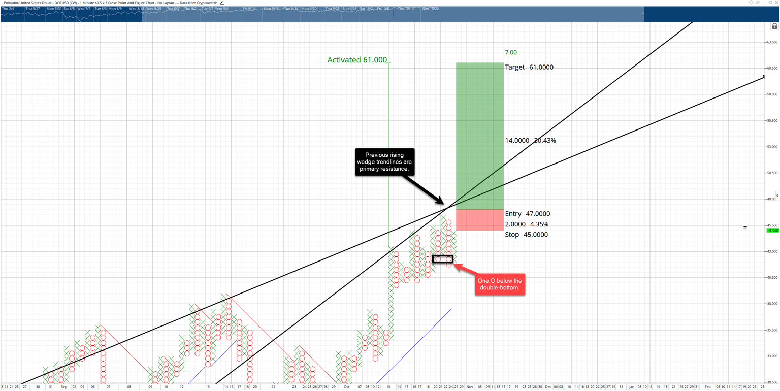 The hypothetical trade idea shows a probable entry at $47. The entry is based on the break of a double-top. Usually, a double-top is not enough reason to take an entry, but one more pattern makes the $47 entry appropriate. The current X column entry would confirm a Bear Trap pattern because the last O-column created an O below the double bottom but failed to move lower. Because of the Bear Trap pattern, additional momentum from trapped shorts will be crucial in Polkadot breaking out above the trendlines.