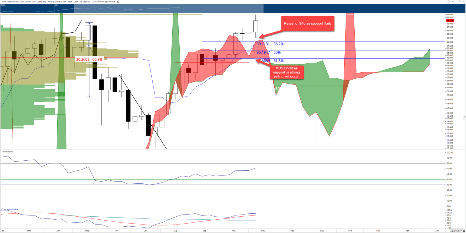 The weekly Tenkan-Sen and the top of the Cloud (Senkou Span B) share the same $40 value area. Because of that shared price level, Polkadot price should find many buyers at that level. Additionally, the upper portion of a high volume node in the 2021 Volume Profile is there as well. If the bulls defend $40 as support, then another leg higher towards new all-time highs will begin.