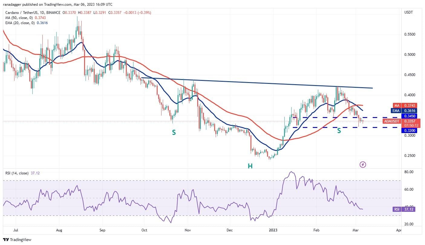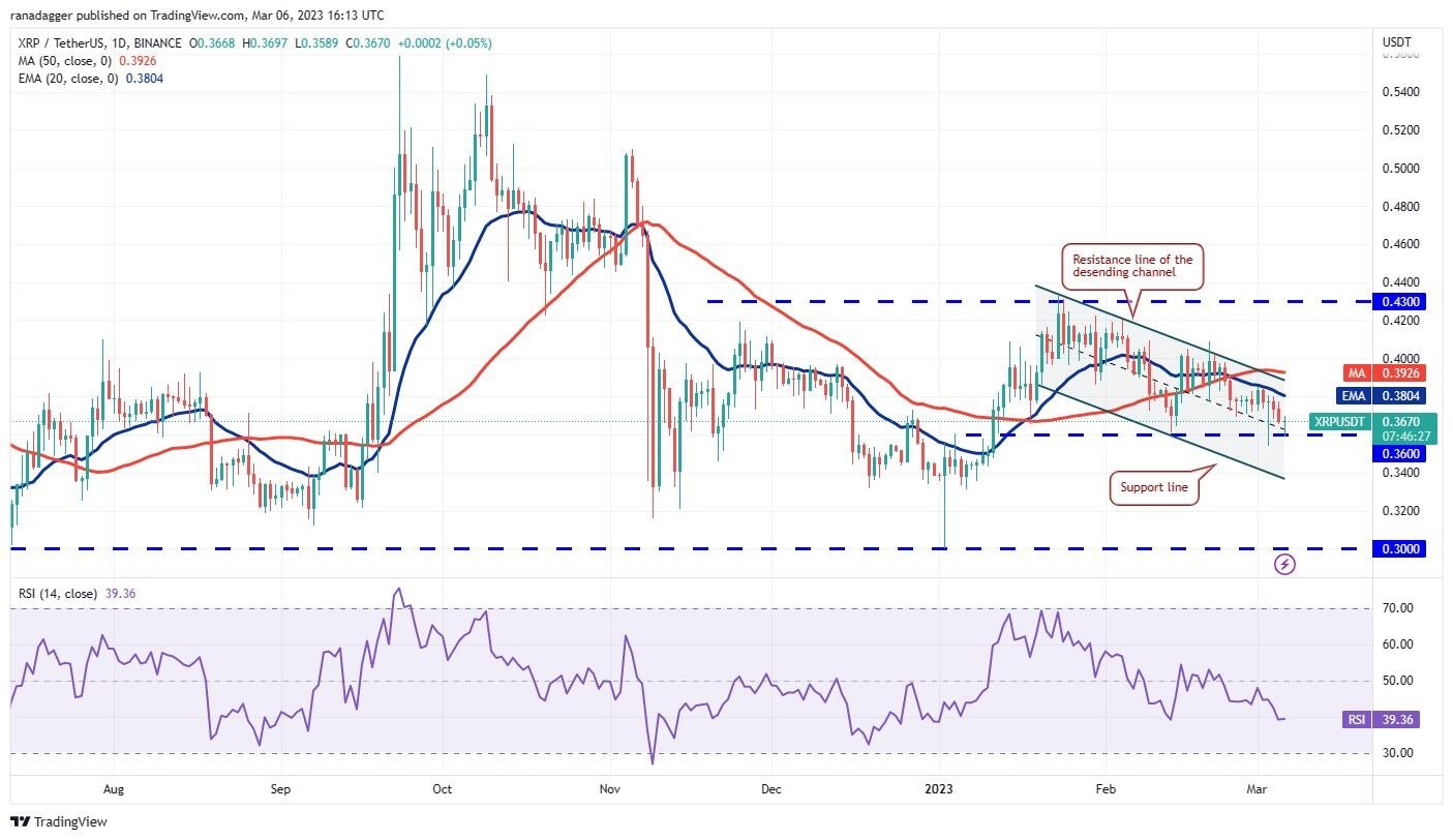 XRP’s rebound off the $0.36 support on March 3 met with strong selling near the 20-day EMA ($0.38). This suggests that the sentiment is negative and traders are selling on rallies.