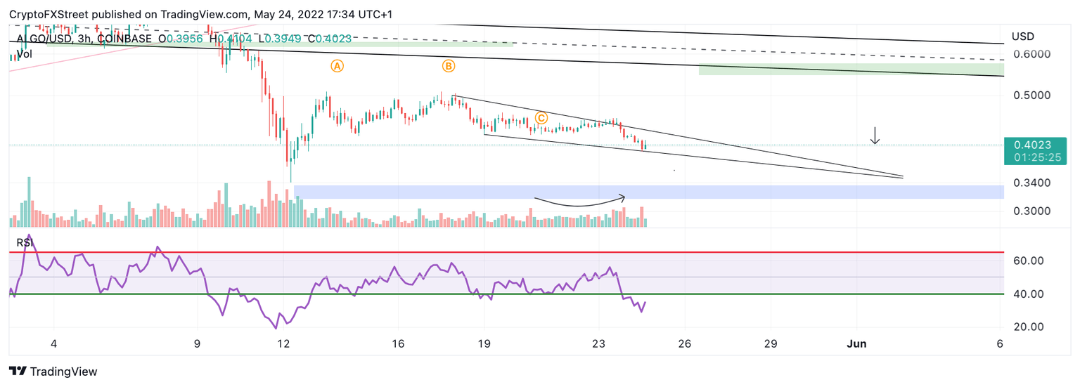 Algorand price is still declining since the steep decline into lows at $0.36 on May 12. The ALGO price action's time-consuming market behavior appears to form a C wave ending-diagonal pattern, which means the downtrend will soon end.