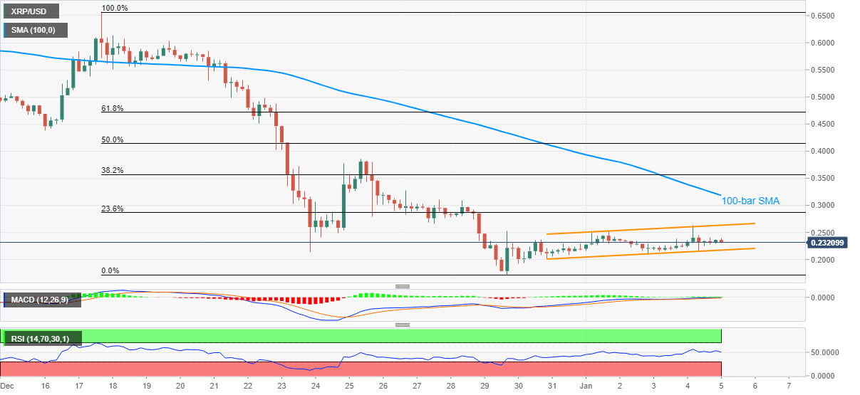 XRP/USD recedes from an intraday high of 0.2400 to 0.2306 during early Tuesday. Even so, the ripple pair remains inside an ascending trend channel formation established since December 30.