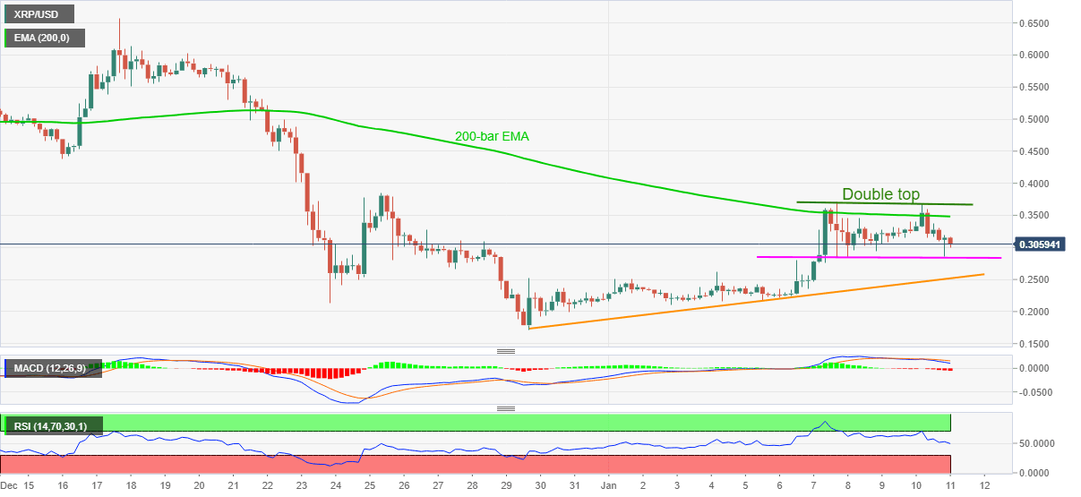 Having failed to cross Friday’s high around 0.3700, XRP/USD drops to 0.3045 during early Monday’s trading. In doing so, the quote portrays a bearish “double top” chart pattern on the four-hour (4H) chart.