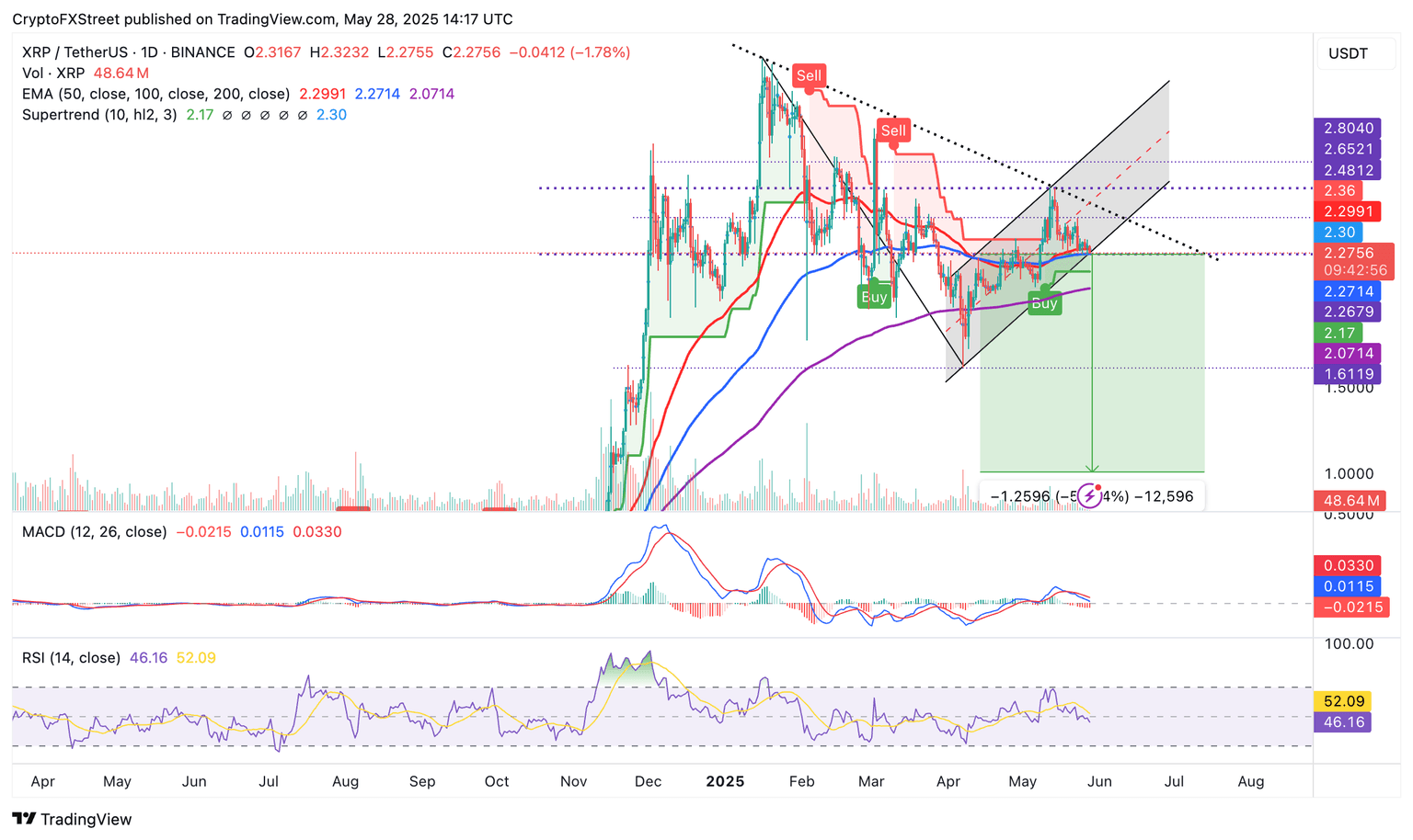 A buy signal is triggered when the XRP price crosses above the SuperTrend line, with the indicator's color changing from red to green. Targets on the upside lie at $2.65, where the XRP price was rejected on May 12, and at $3.00, a psychological resistance level.