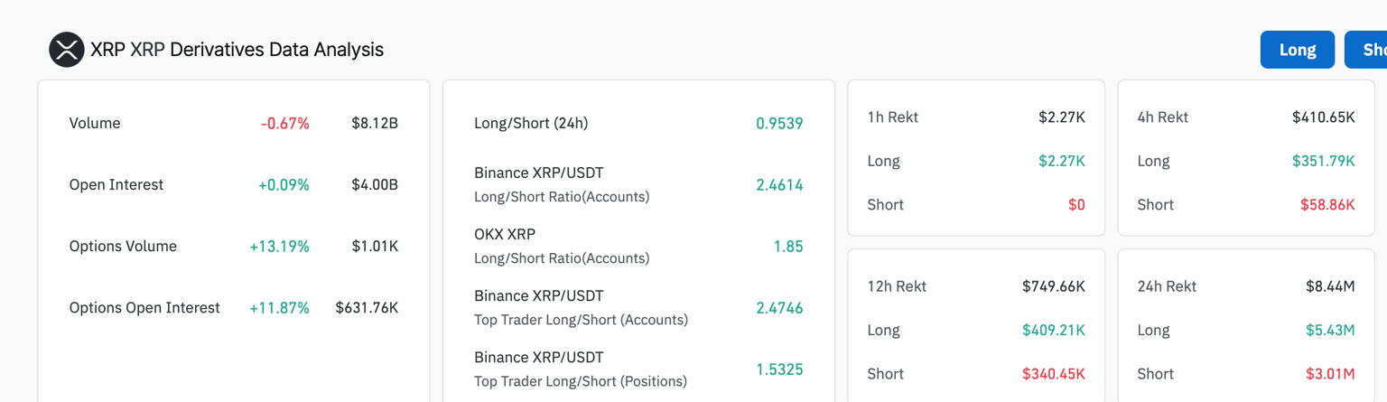The derivatives data from Coinglass highlights a slight increase in Open Interest (OI) of 0.09% to $4 billion, indicating that new positions are being opened, which reflects growing trader interest.