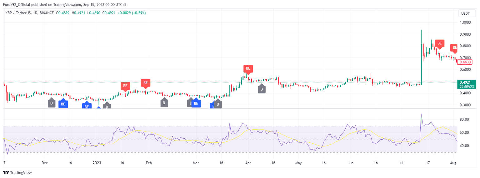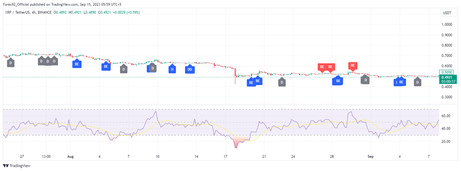 Ripple recently broke below its crucial 200-day MA at around $0.51, signaling a bearish outlook. This level was seen as a pivot point for the asset; its breach marks a significant shift in market sentiment towards the bearish side. The price had been consolidating near this MA since mid-August but has now succumbed to selling pressure.