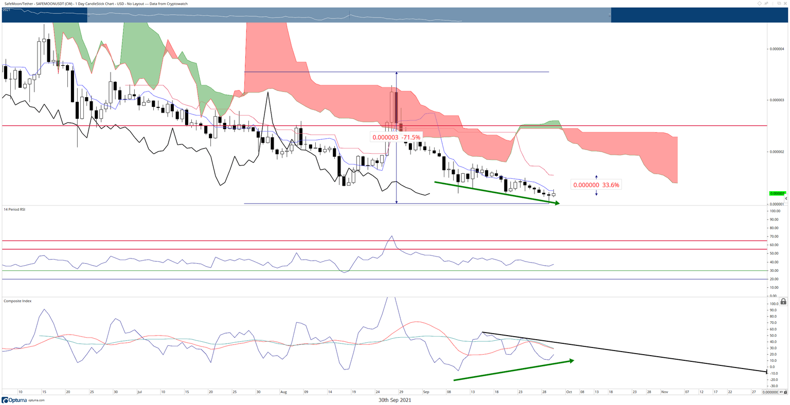 If buyers can support Safemoon price above the Tenkan-Sen at $0.0000013, the oscillators may support a sustained move to $0.0000016. The Relative Strength Index is currently in bear market conditions but is relatively flat. However, the Composite Index shows higher lows while the candlestick chart shows lower lows – regular bullish divergence. Additionally, if the Composite Index crosses above the trendline, Safemoon price will likely have enough momentum to hit the target area.