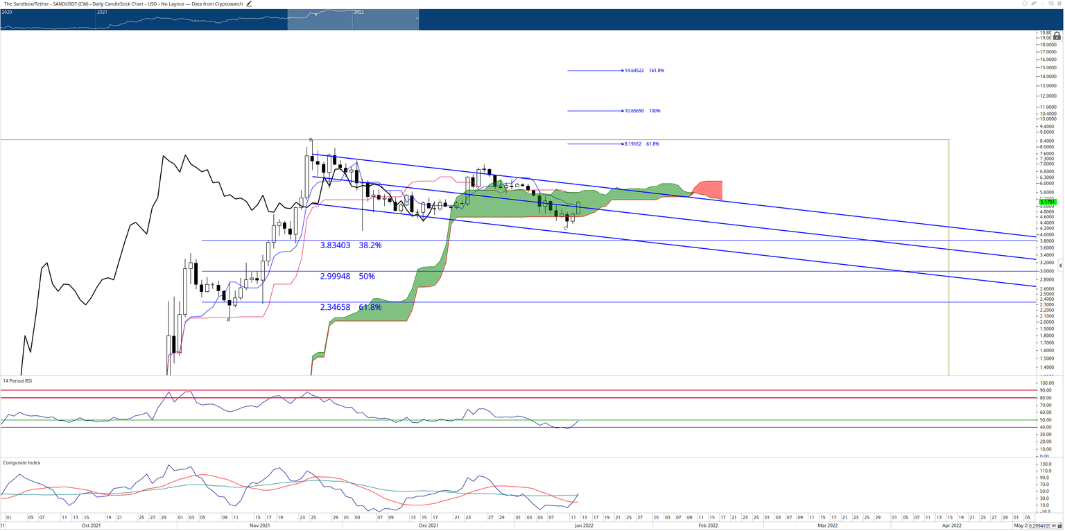However, a clear breakout with a daily close above $5.80 would fulfill all the conditions needed for an Ideal Bullish Ichimoku Breakout entry – the most critical condition being the Chikou Span in open space. If Sandbox price achieves a close above $5.80, it should have a wide-open road to test new all-time highs near the 100% Fibonacci expansion at $10.66 and the 161.8% Fibonacci expansion at $14.65.