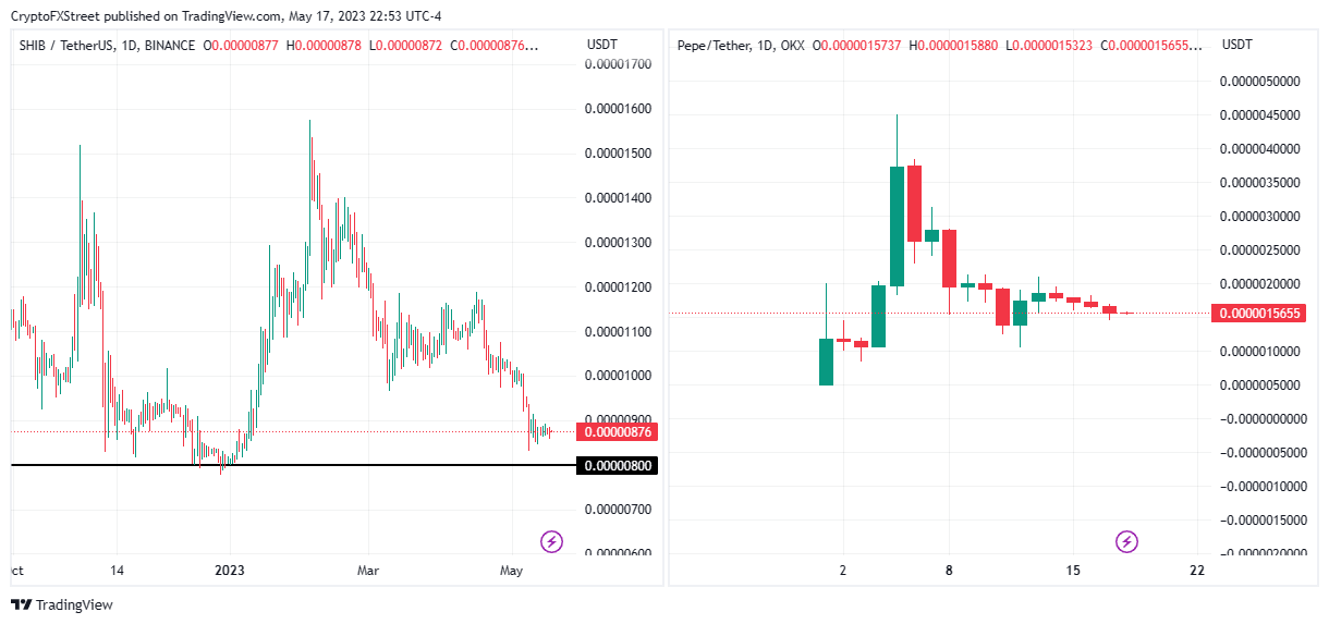 SHIB/USDT 1-day chart, PEPE/USDT 1-day chart
