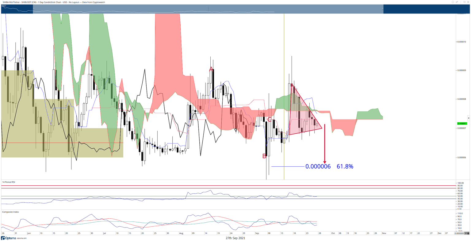 Shibu Inu is presently trading inside the very end of a triangle pattern. Typically, breakouts from any pennant or triangle pattern occur within the last 1/3rd of the triangle. However, Shibu Inu is trading near the pattern's apex and has one more day before it will slide out of the pattern due to time and not price.
