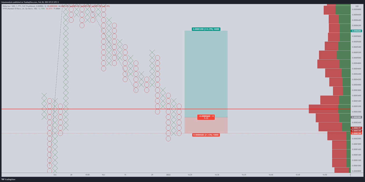 Shiba Inu price has generated some bullish structure despite the current lows it is trading near. All of the conditions required to fulfill an Ideal Bullish Ichimoku breakout are complete save one: the current Close above the Ichimoku Cloud. If bulls can push Shiba Inu price to a close at or above $0.000029 to $0.000030, then that pattern will be complete, likely extending SHIBA’s run towards the $0.000054 value area. But an earlier entry is currently available on its Point and Figure Chart.