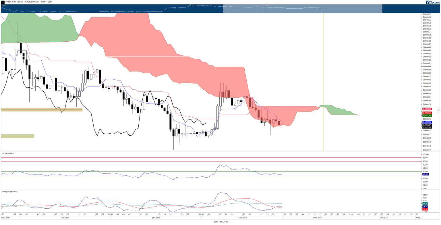 Shiba Inu price has continued to slide south by marginal increments over the past week. However, the bottom of the Ichimoku Cloud (Senkou Span AB) has acted as a strong support zone and has prevented further sell-offs.