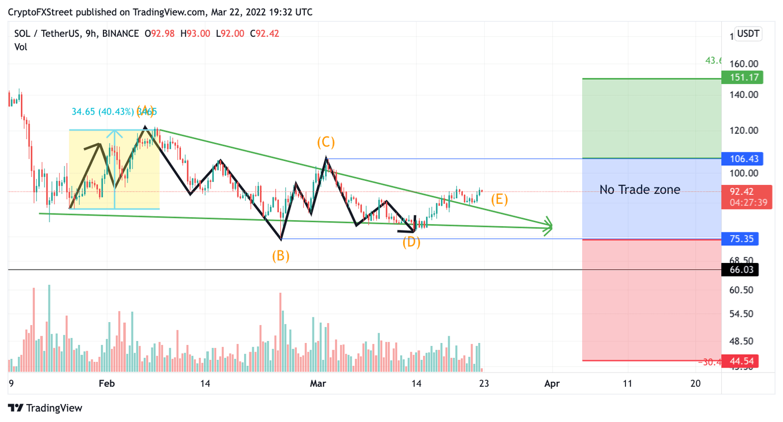 Solana price on the 9-hour chart has contradicting signals as both the bears and bulls have been present on the volume profile indicator. It was mentioned in last week’s thesis that a break above Wave C at $106 could be the catalyst to propel SOL price an additional 40% higher based on technical projections. This idea remains as Solana price is currently 15% below the breakout zone.